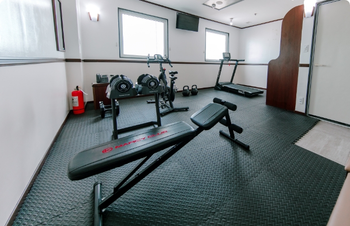 リラックスできるマッサージルーム、軽い運動ができるジムルーム、無料の朝食ビュッフェなど、